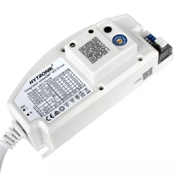 The Hytronik HEC7028 is an advanced constant current LED driver with an integrated occupancy sensor, designed for efficient and intelligent lighting control. It operates on an input voltage of 220~240VAC and provides a constant current output ranging from 350mA to 900mA, with a voltage range of 10~48VDC. The driver features dimming functions, including daylight monitoring and a tri-level "Corridor" function, making it ideal for energy-saving applications. With an operating temperatures range of -20ºC to +50ºC, the HEC7028 ensures reliable performance in various environments. It also features a rear cable exit and push terminals for easy installation. Certified with CE, CB, and RCM approvals, this driver comes with a 5-year warranty for added peace of mind.